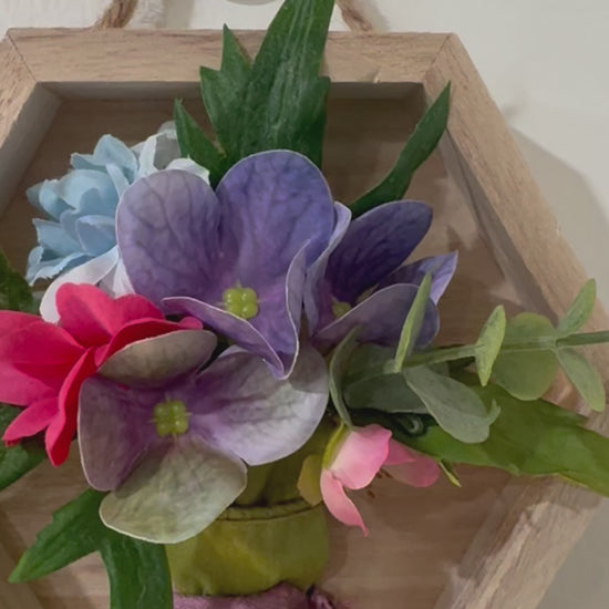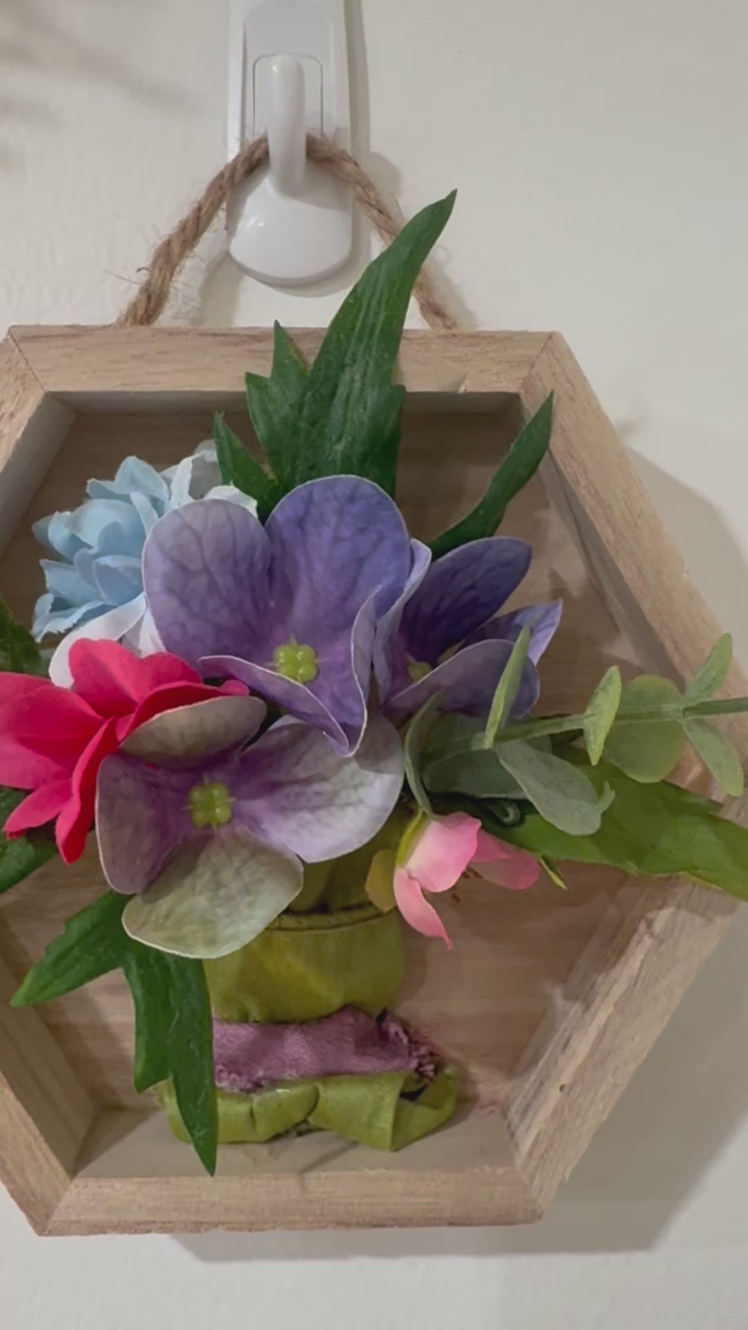 Experience the beauty of nature in a unique way with our Mini Floral Vase shadow box. Made with upcycled silk ribbon scraps and delicate blossoms, this custom piece is a perfect addition to any space. Housed in a 5x5" Hexagon shadow box with multiple hanging options, it's ready to bring a touch of nature into your home.