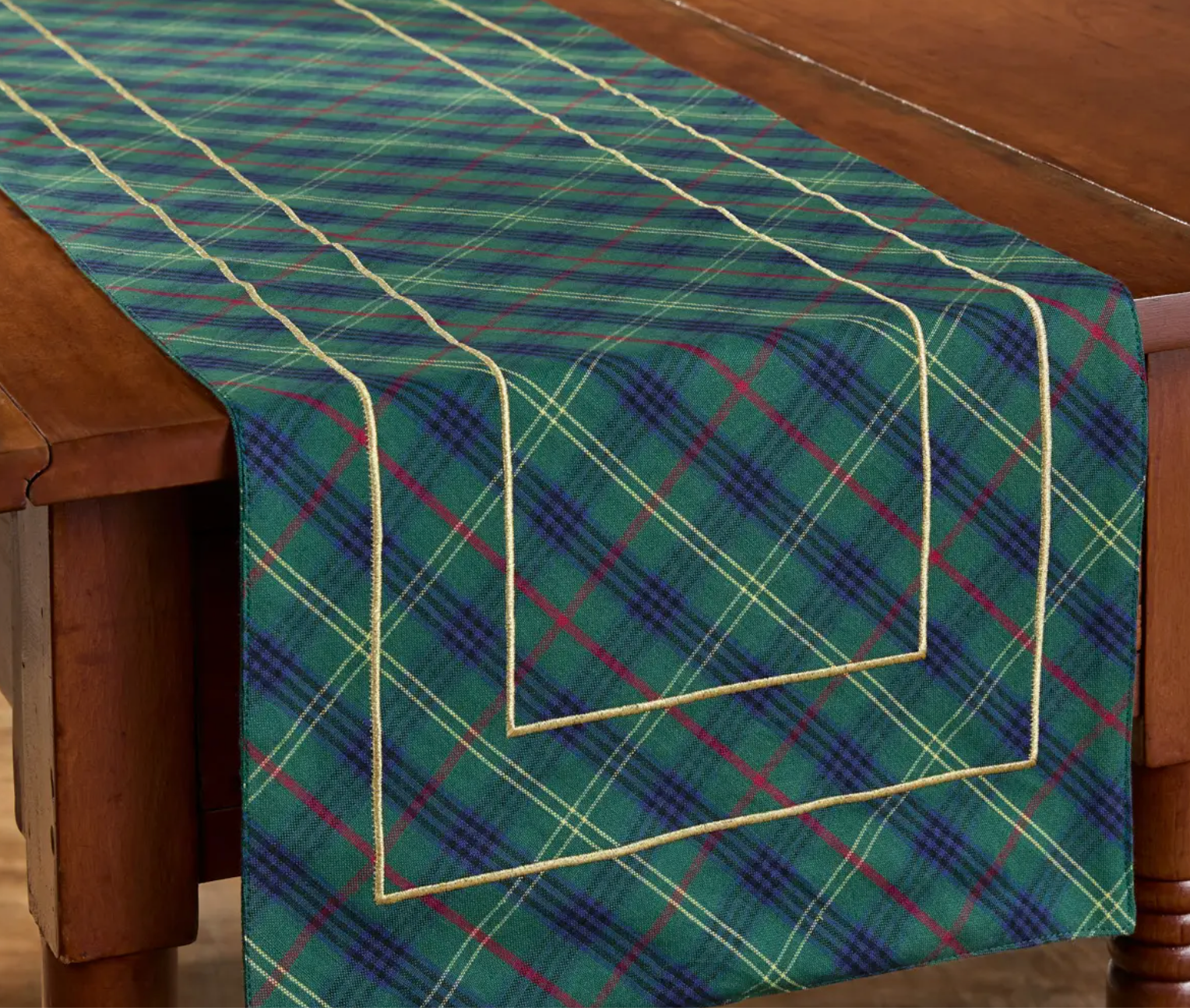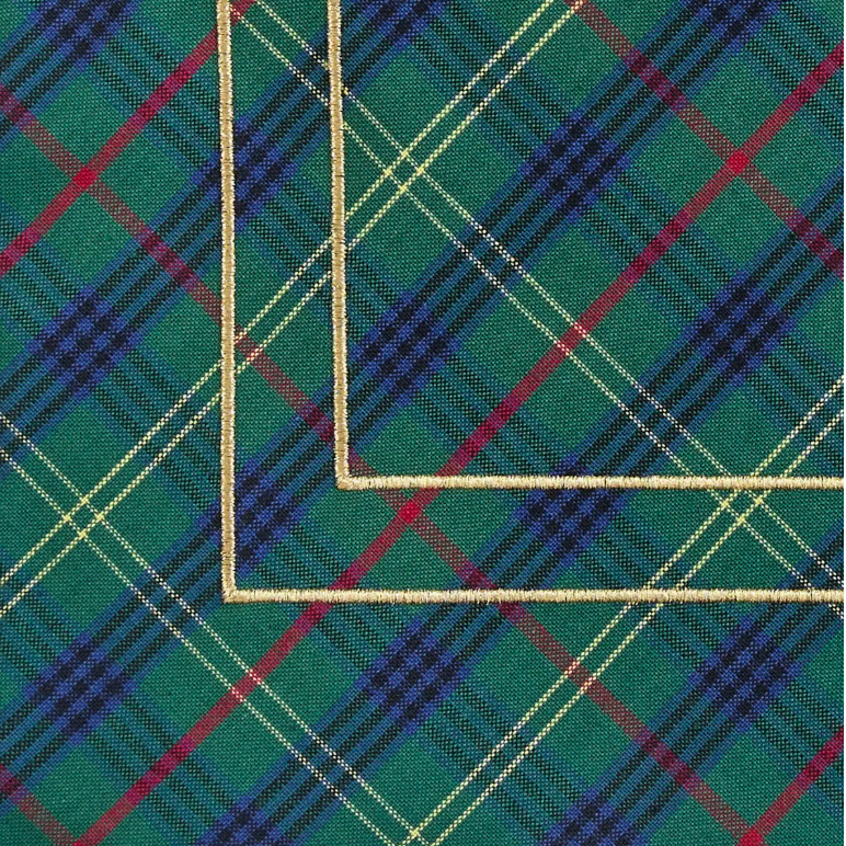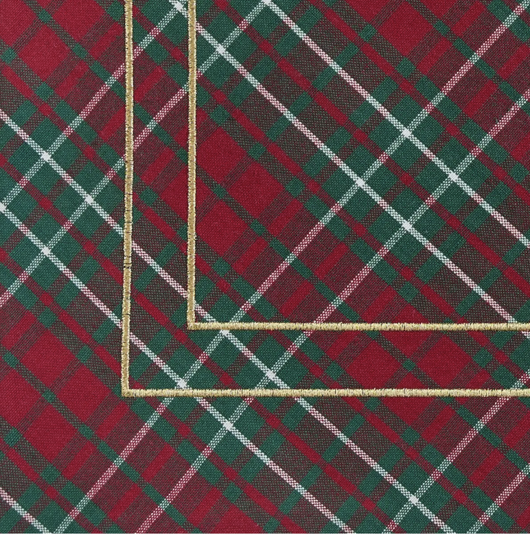 Beautiful table runners in festive holiday plaid and gold border. Available in 36" or 54" Lengths. This elegant table runner is an ideal accessory for any home holiday setting. Whether you're hosting a dinner party or simply want to add a touch of sophistication to your kitchen, this table runner is sure to impress.
